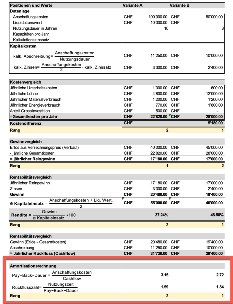Die nachfolgende Abbildung zeigt als Beispiel ein Berechnungsbeispiel die Amortisationszeit anhand zweier Varianten.
