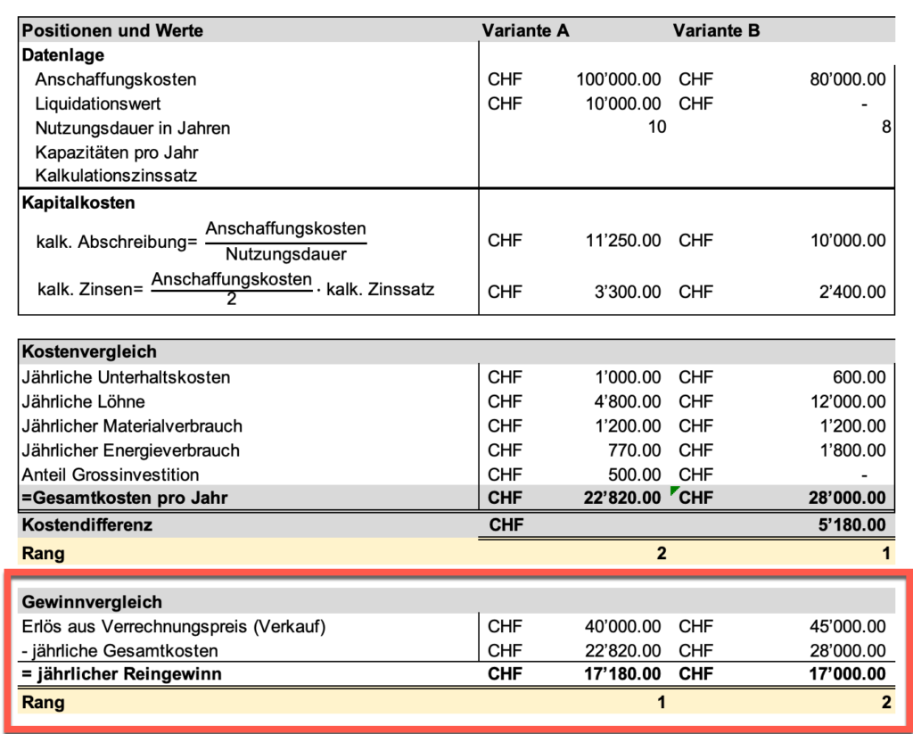 Die nachfolgende Abbildung zeigt als Beispiel ein Berechnungsbeispiel des Gewinnvergleich anhand zweier Varianten.