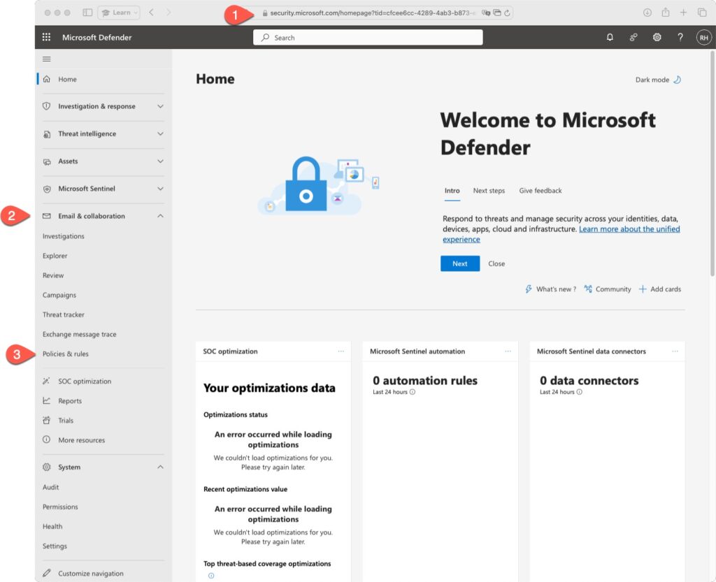 Eine neue Anti-Malware-Richtlinie wird anhand der folgenden Schritte erstellt.Schritt 1: Öffnen Sie das Microsoft Defender-Portal (https://security.microsoft.com). Gehen Sie dann zu «Email & Collaboration» und navigieren Sie weiter zu «Policies & rules».