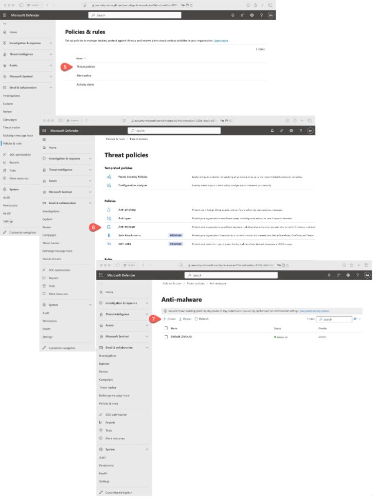 Schritt 2: Navigieren Sie zu «Threat policies», wählen Sie dann «Anti-malware» und erstellen Sie Ihre neue «Anti-Malware-Richtlinie» über die Schaltfläche «Create».