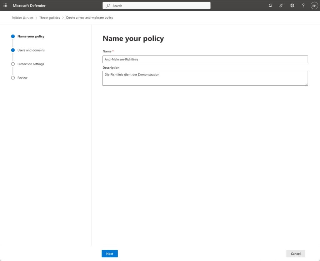 Schritt 3: Geben Sie der Anti-Malware-Richtlinie einen eindeutigen Namen und fügen Sie eine kurze Beschreibung hinzu.