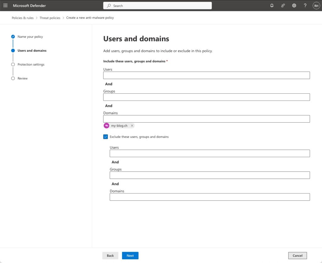 Schritt 4: Bestimmen Sie, auf welche Benutzer, Gruppen oder Domänen die neue Anti-Malware-Richtlinie angewendet werden soll, und schließen Sie bei Bedarf Benutzer, Gruppen und Domänen von dieser Richtlinie aus.