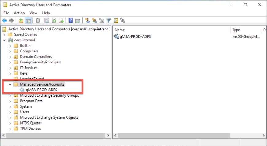 Wissenswert: Im Active Directory erscheint der neu erstellte Service Account unter ‘Managed Service Accounts’, siehe nachfolgende Abbildung.