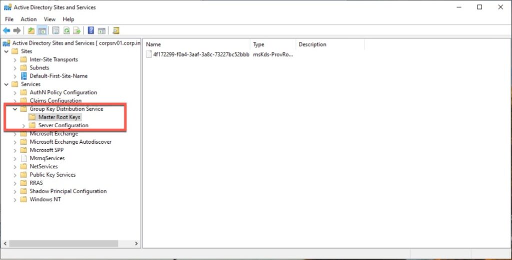 Wissenswert: Dieser Befehl reduziert die 10-stündige Wartezeit für die Replikation innerhalb der Domäne auf 0, sodass gMSA-Konten sofort erstellt werden können, und erstellt unter «Active Directory Sites and Services» den «Group Key Distribution Service»