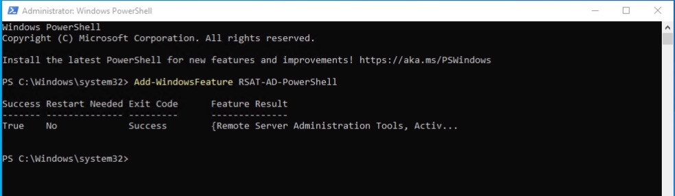 Schritt 3: Installation der Remote Server Administration Tools mit Befehl ‘Add-WindowsFeature RSAT-AD-Powershell’ den Servern, welche den gMSA-Account verwenden sollen.