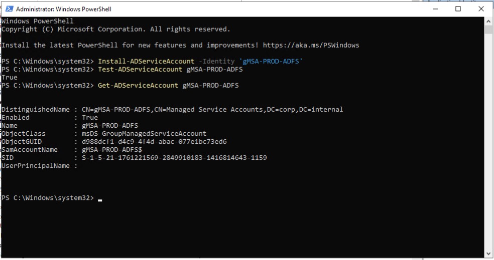 Schritt 4: Installieren Sie das gMSA-Konto auf dem Server mit dem Befehl ‘Install-ADServiceAccount -Identity ‚gMSA-PROD-ADFS‚’ und überprüfen Sie die Funktionalität mithilfe des Befehls ‘Test-ADServiceAccount gMSA-PROD-ADFS’.