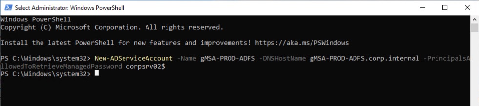 Schritt 2: Mit dem folgenden Befehl ‘New-ADServiceAccount -Name gMSA-PROD-ADFS -DNSHostName gMSA-PROD-ADFS.corp.internal -PrincipalsAllowedToRetrieveManagedPassword corpsrv02$‘ wird der Service Account ‘gMSA-PROD-ADFS’ erstellt, und der Server CORPSRV02 erhält die Berechtigung zur Nutzung dieses Service Accounts.