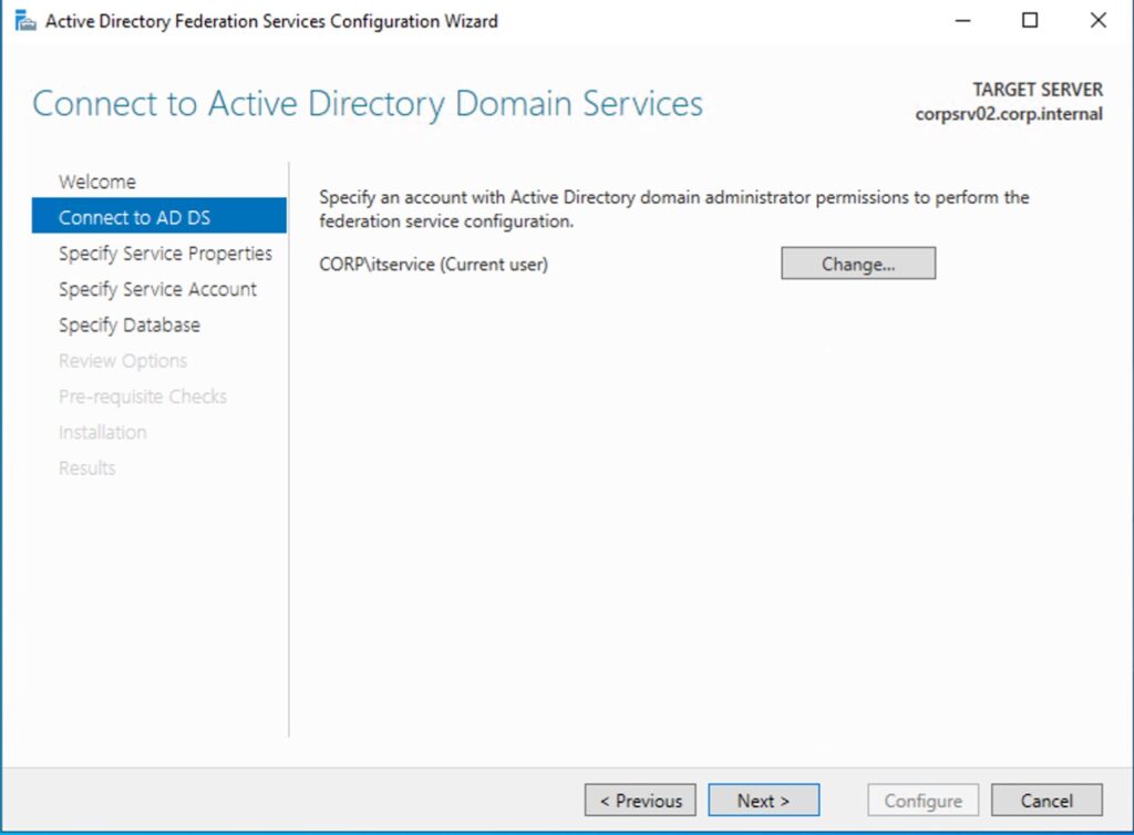 Schritt 5: Wählen Sie den zuvor erstellen Managed Service Account für ADFS aus. Klicken Sie auf ‘Next’ um fortzufahren.