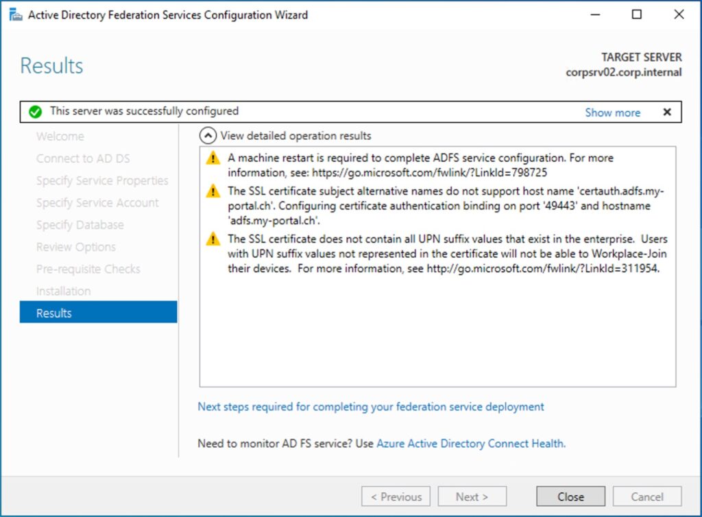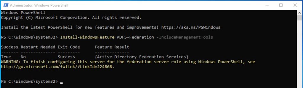 Schritt 1: Installieren Sie die ADFS-Rolle über den Befehl ‘Install-WindowsFeature ADFS-Federation -IncludeManagementTools’