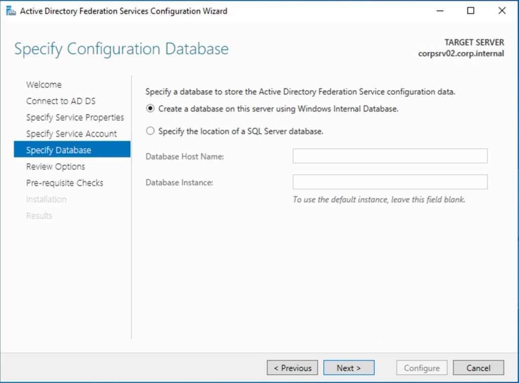 Schritt 6: Wählen Sie «Create a database on this server using Windows Internal Database». Klicken Sie auf ‘Next’ um fortzufahren.