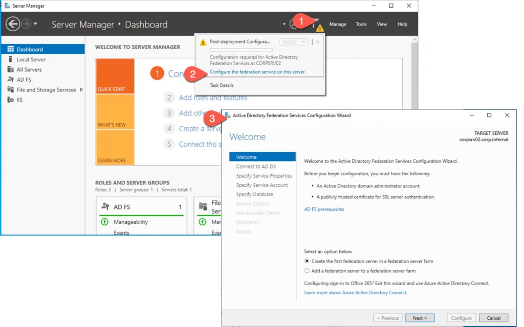 Schritt 2: Öffnen Sie den Server Manager und klicken Sie auf «Configure the federation on this server» und wählen Sie «Create the first federation server in a federation server farm»