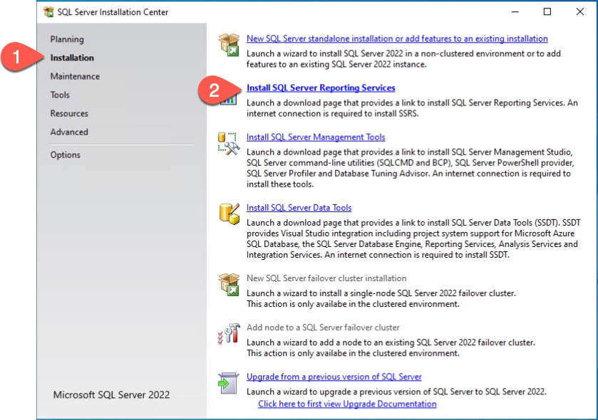 Schritt 1: Führen Sie „setup.exe“ vom Installationsmedium als Administrator aus und wählen Sie dann unter Installation «Install SQL Server Reporting Services» aus.