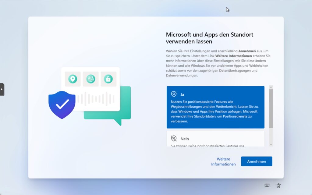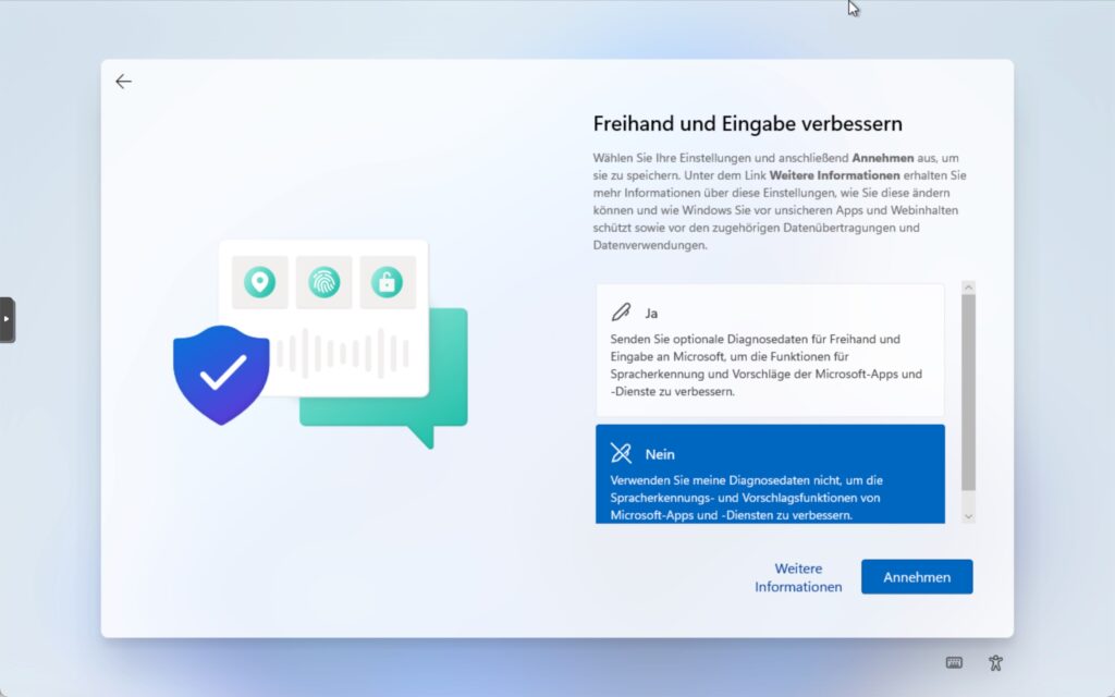 Schritt 7: Wählen Sie «Nein» um auszuschliessen das Ihre Daten nicht zur Verbesserung der Spracherkennung verwendet wird. Klicken Sie auf ‘Annahmen’ um fortzufahren.