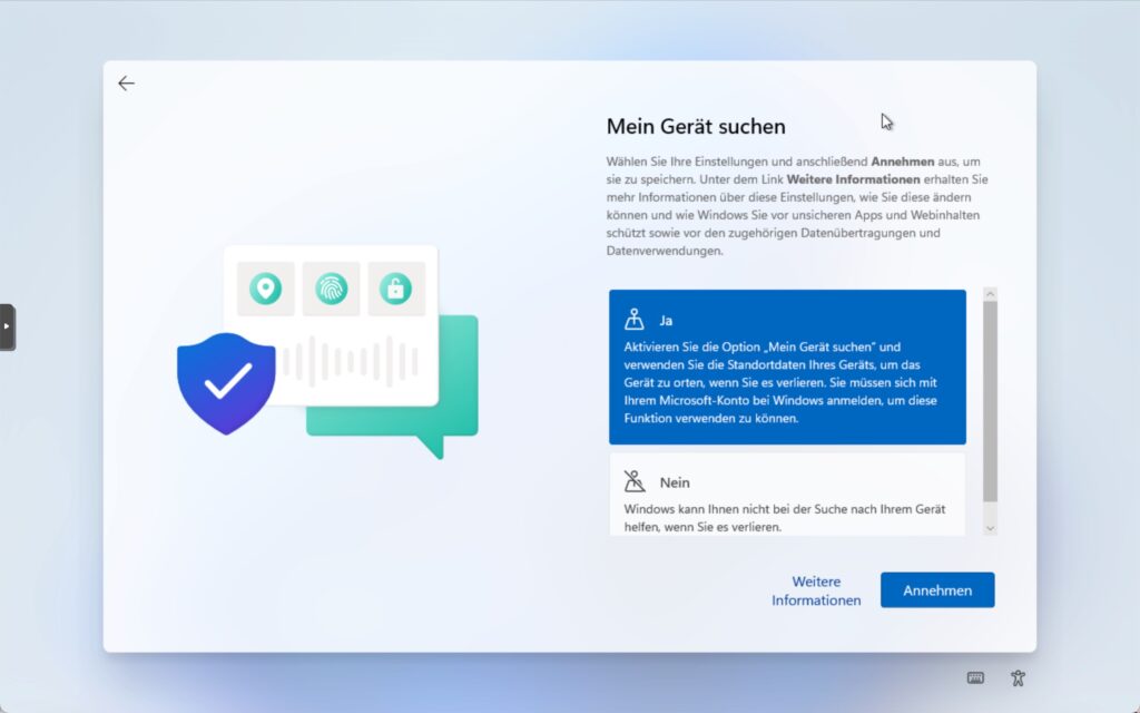 Schritt 5: Aktivieren Sie «Mein Gerät suchen». Klicken Sie auf ‘Annahmen’ um fortzufahren.