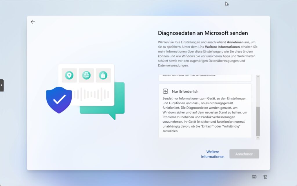 Schritt 6: Wählen Sie «Nur Erforderliche» Diagnosedaten an Microsoft senden. Klicken Sie auf ‘Annahmen’ um fortzufahren.