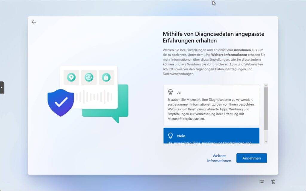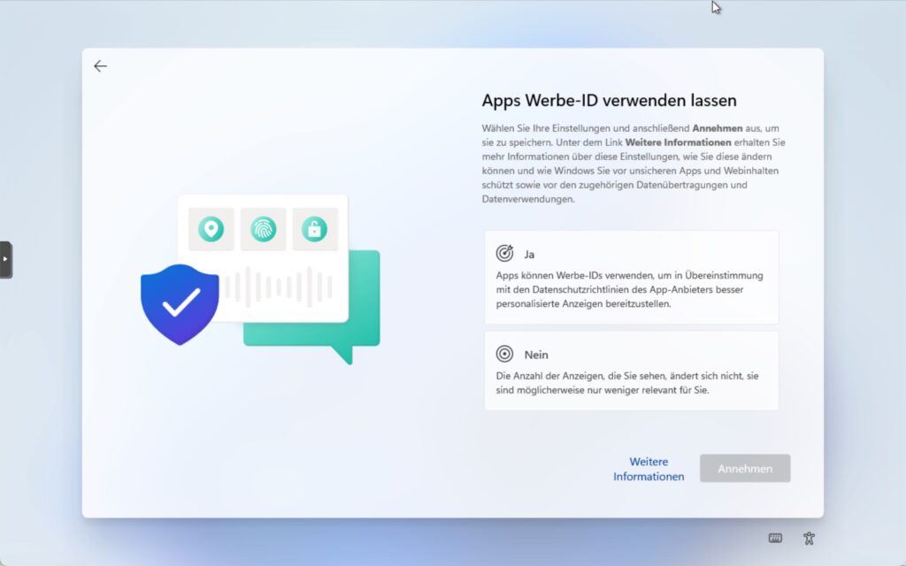 Schritt 9: Wählen Sie «Nein» um Werbungen soweit möglich zu minimieren. Klicken Sie auf ‘Annahmen’ um fortzufahren.