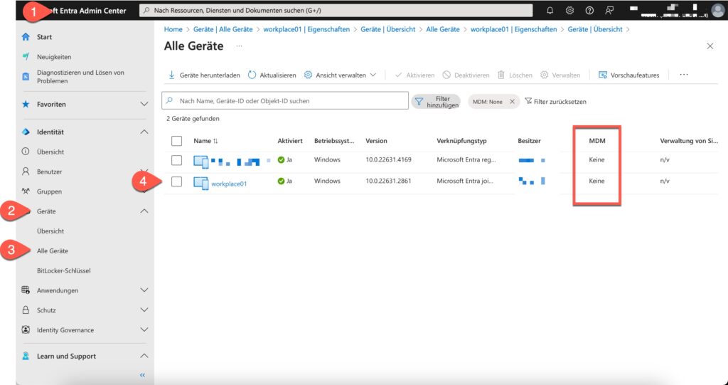 Wissenswert: In Microsoft Entra (https://entra.microsoft.com) wird in Geräte unter ‘Alle Geräte’ das neu hinzugefügte Gerät aufgeführt. Das Gerät selber wird nicht verwaltet, denn dieses ist keinem MDM zugewiesen.