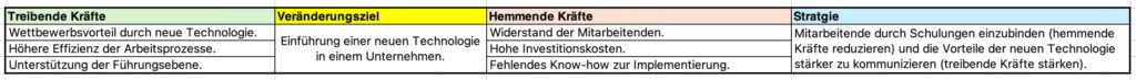 Durch die Identifizierung und Bewertung der treibenden und hemmenden Kräfte können Organisationen gezielte Strategien entwickeln, um den Veränderungsprozess zu unterstützen und zu fördern.