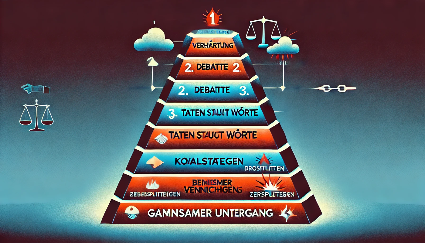 | 9: Gemeinsam in den Abgrund | Vernichtung der Gegenseite. In der letzten Phase wird der Schaden der Gegenseite wichtiger als der eigene Nutzen; auch selbstzerstörerische Massnahmen werden in Kauf genommen. |