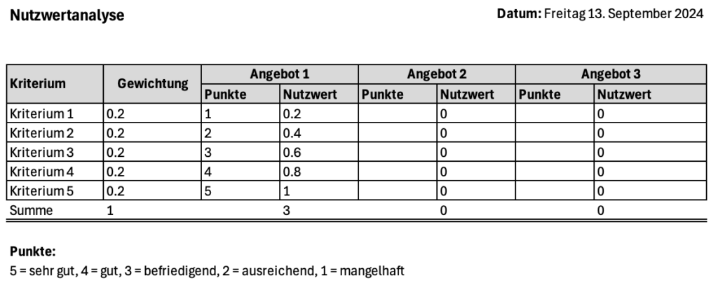 - Berechnung des Gesamtnutzens: Die Punkte für jedes Kriterium werden mit der Gewichtung multipliziert und summiert, um einen Gesamtwert pro Angebot zu erhalten.