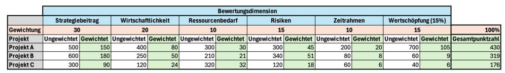 Das Projekt A hat die höchste Gesamtpunktzahl und passt am besten zur strategischen Ausrichtung des Unternehmens, bietet den höchsten Nutzen und hat ein ausgewogenes Risiko. Das Projekt B ist wirtschaftlich sehr vorteilhaft, aber weniger strategisch relevant und hat höhere Risiken und das Projekt C hat einen hohen Ressourcenbedarf, bietet aber auch einen moderaten Nutzen. Basierend auf dieser Bewertung sollte Projekt A priorisiert und mit den verfügbaren Ressourcen unterstützt werden.